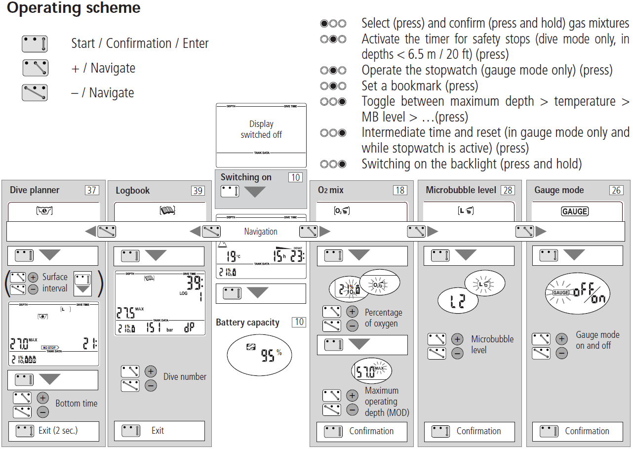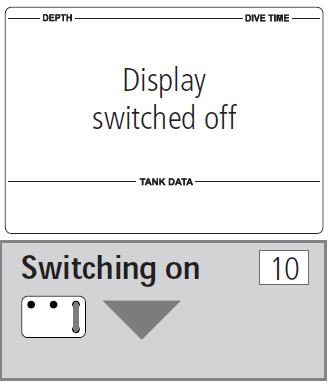 Looking at the picture above, there are two menus to the left of center and three to the right. What I am calling center is the column showing Display switched off, Switching on, Battery capacity. At this point your dive computer should be turned off, if not it should be at its Main Menu and will return to the Main Menu after about 30 seconds if no action is being taken by you.