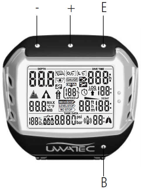 Contacts. There are FOUR contacts on the Uwatec tec. Three are found at the top and one on the bottom right. They look like silver buttons. The picture below shows the contacts marked as – + E B.
