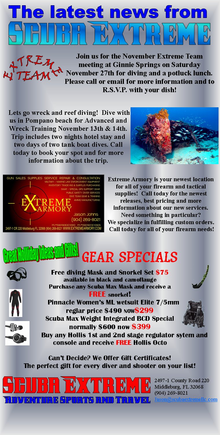 Rock on ScubaExtreme! November looks like a fun month. Pompano Nov. 13-14th. Free food at Ginnie! What else do you need? Yes, Friends. Email or call Scubaextreme for details. Winters coming upon us. If your hanging up your mask for the winter, first, your hanging it up too soon. We’re still diving! Get your training done before the outside weather gets too cold. Florida springs are a constant 72ish degrees F year round and one of the advantages of living in the Sunshine state, the Springs are crystal clear.