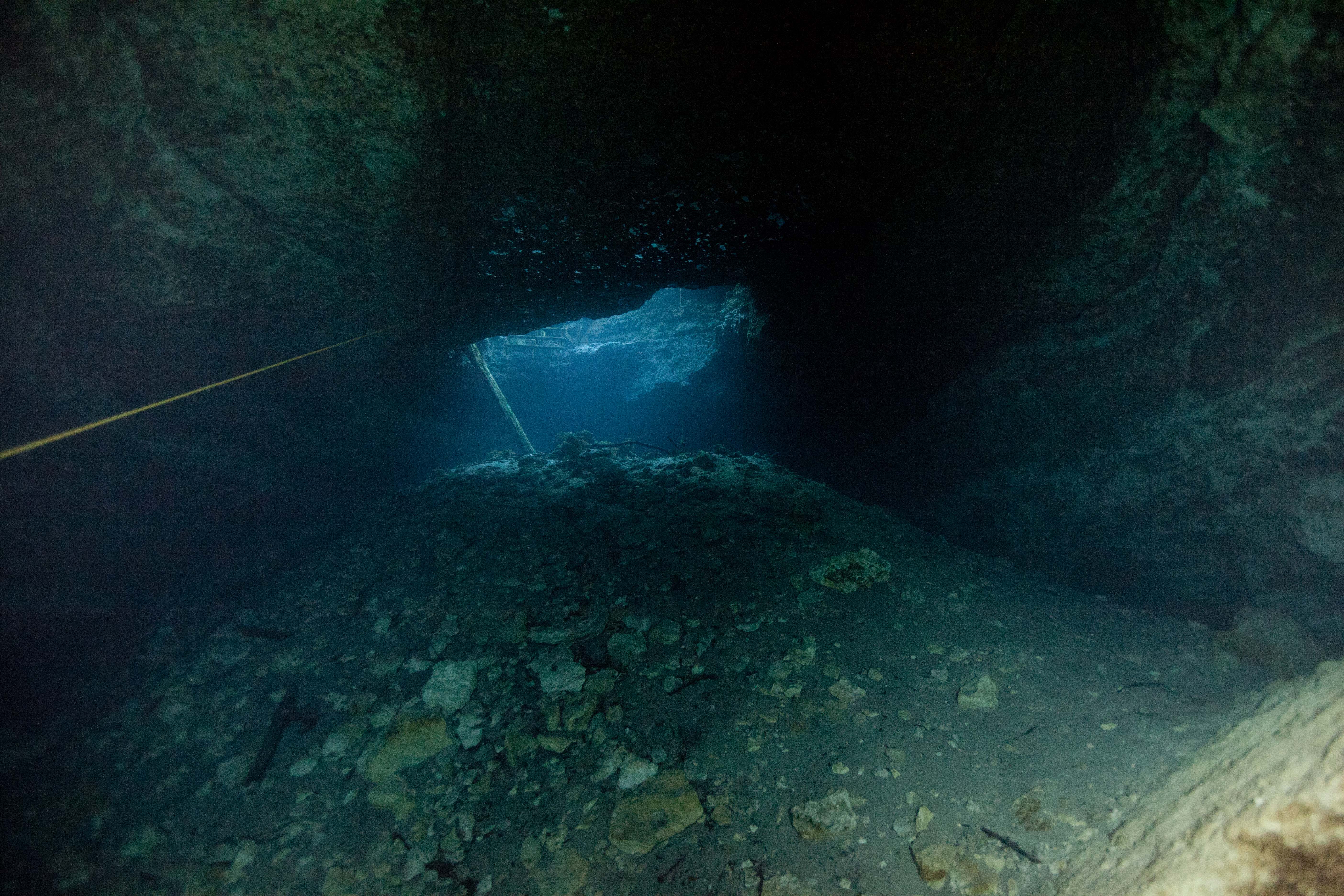 I am beginning to think the divers that will follow me in will think I silted up the place. So I check the camera, take a few shots and begin down the shaft, into the large ball room.